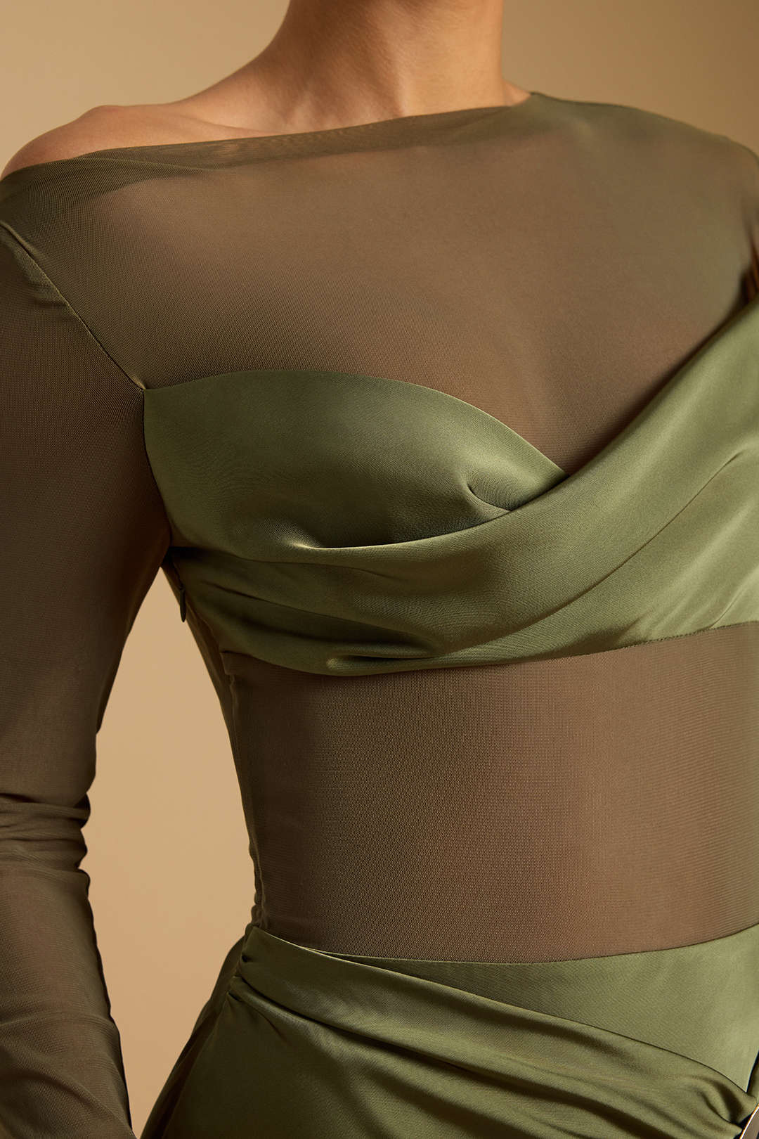 Satin Mesh Patchwork Metallic Asymmetric Ruched Long-Sleeve Midi Dress