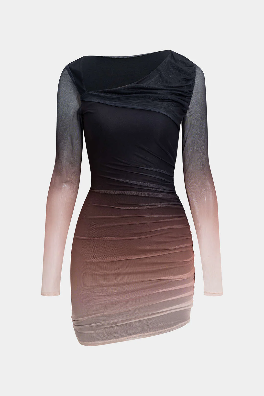 Mesh Color - Block Print Asymmetric Ruched Long - Sleeve Mini Dress