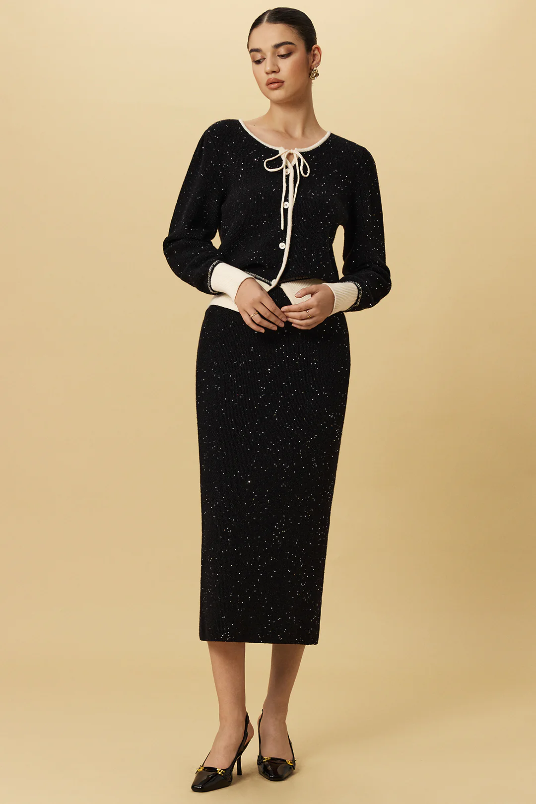 Knit Contrast Button Tie-Up Long-Sleeve Top