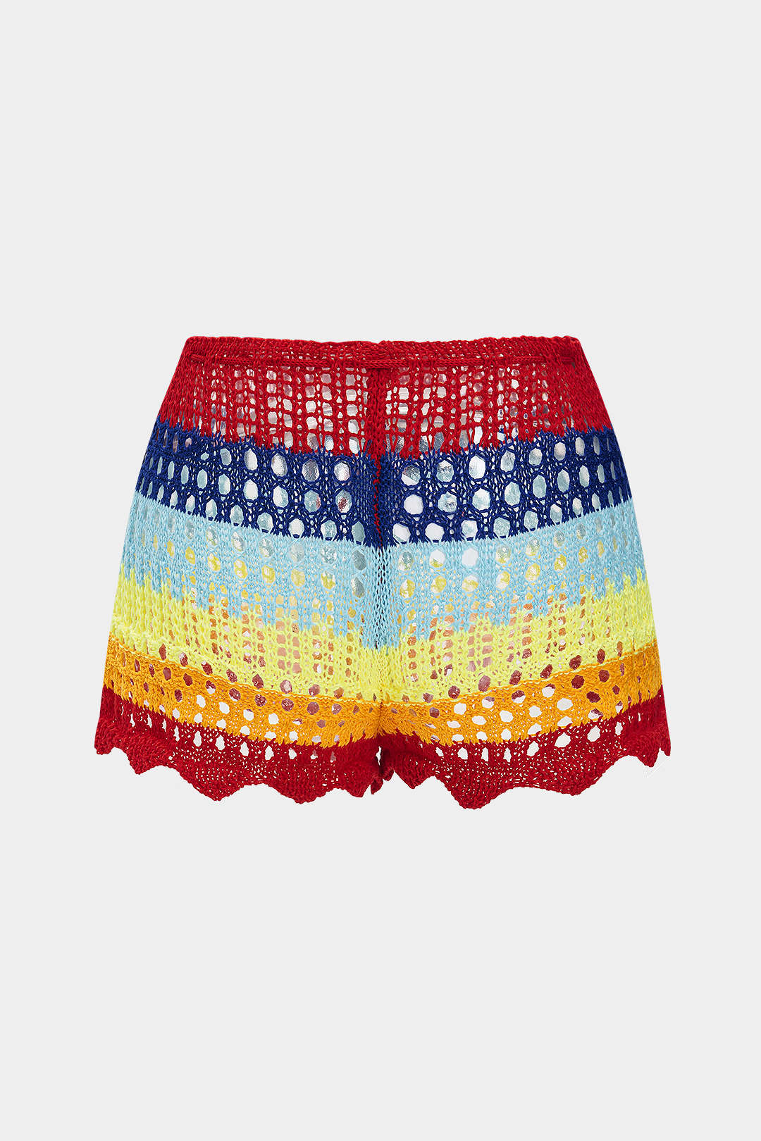 Contrasting Knit Hollow-Out Drawstring Shorts