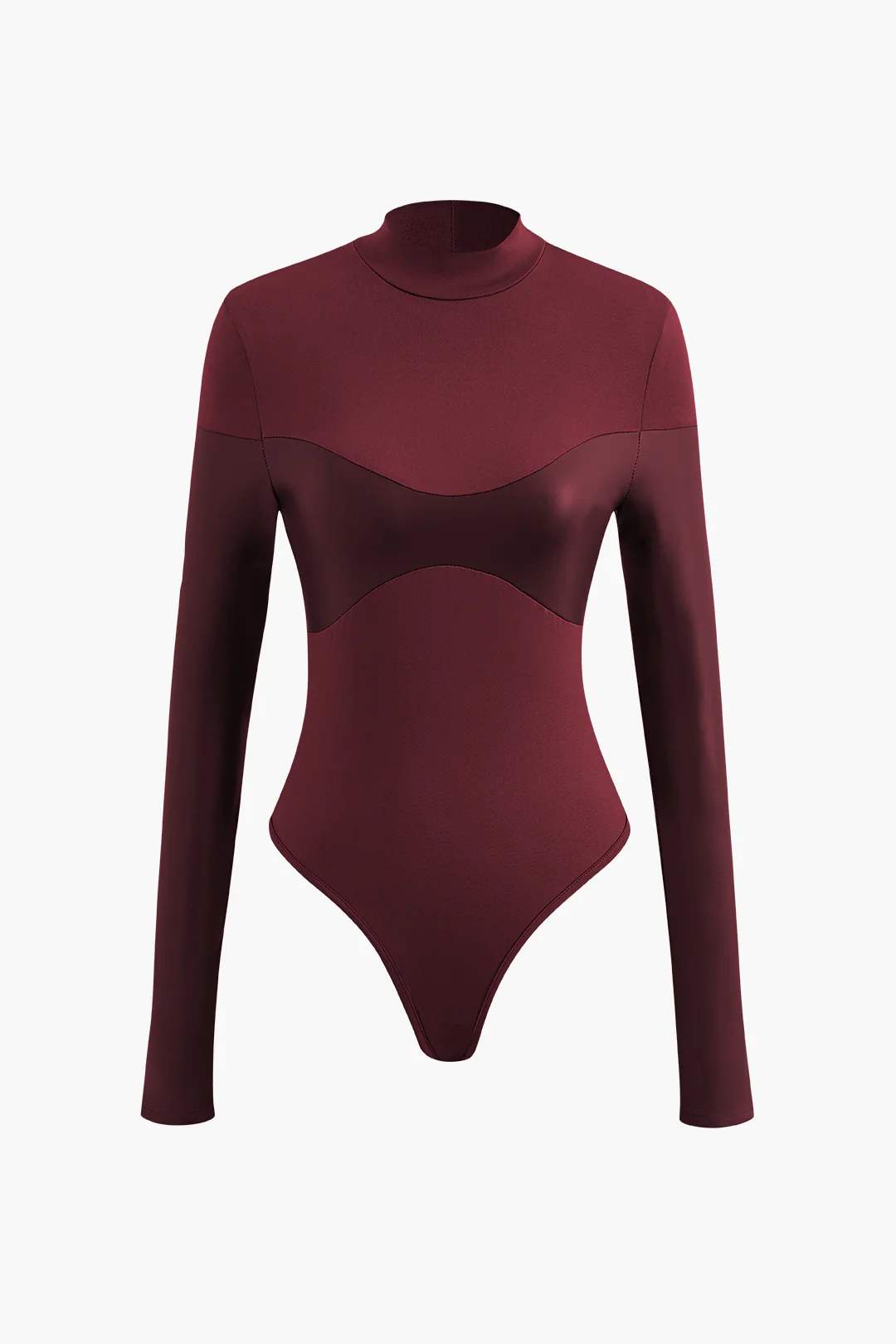 Mock Neck Faux Leather Panel Long Sleeve Bodysuit