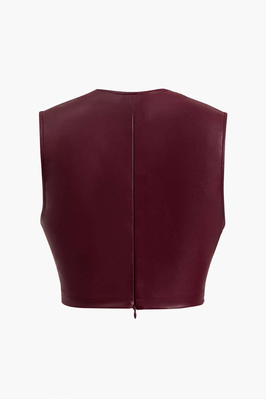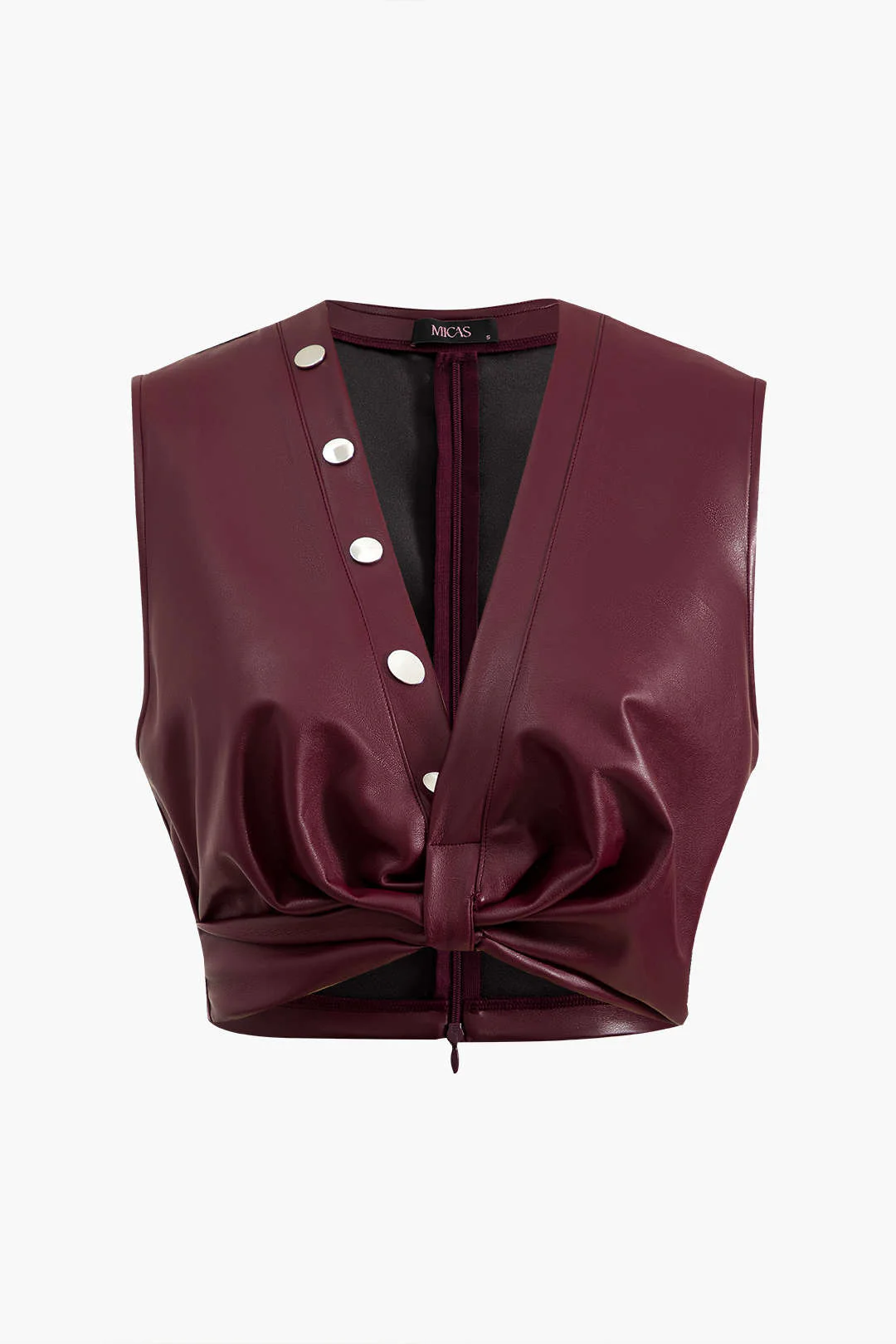Button Detail Twisted Front Faux Leather Crop Tank Top