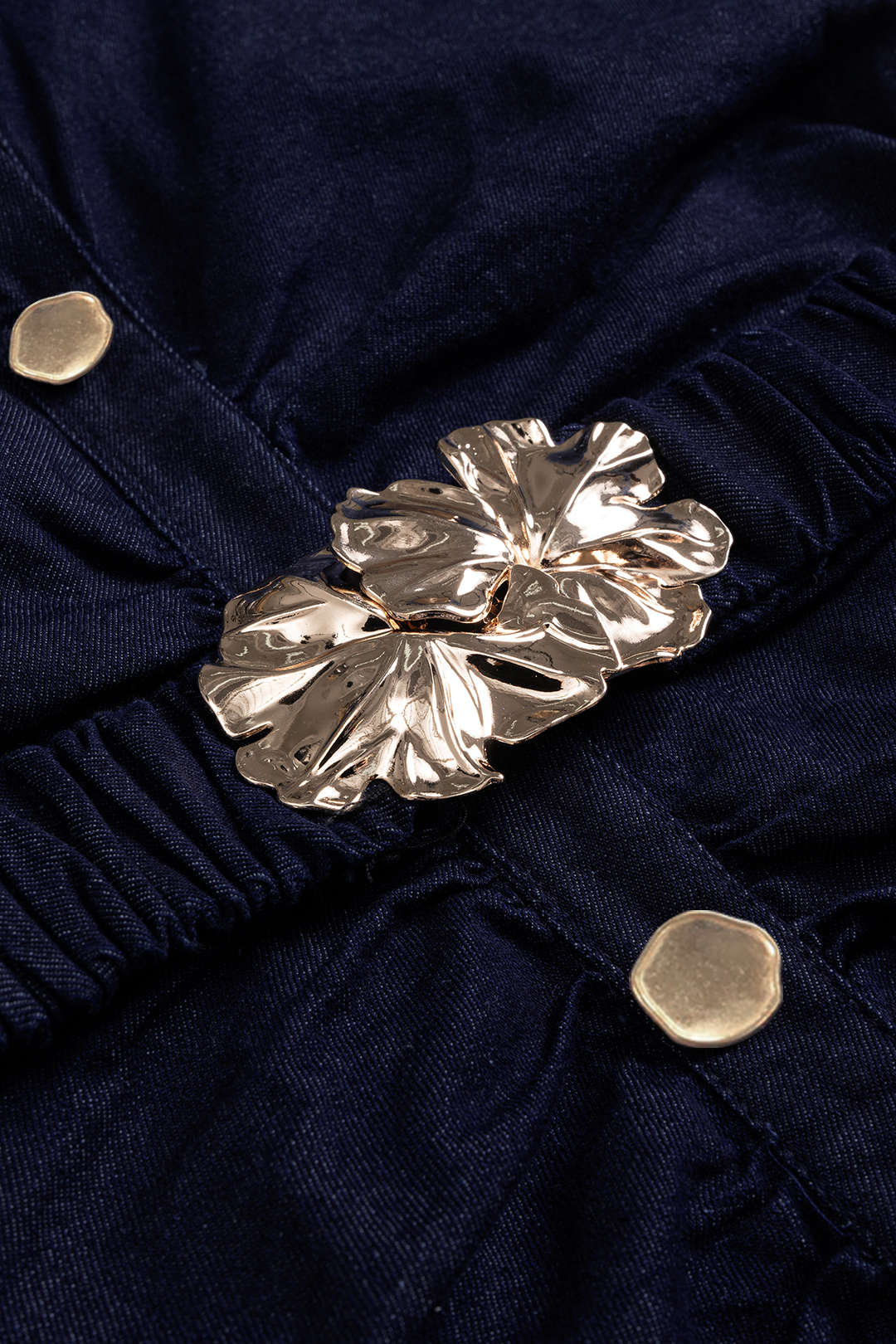 Metallic Button Belted Ruched Short Sleeve Denim Dress