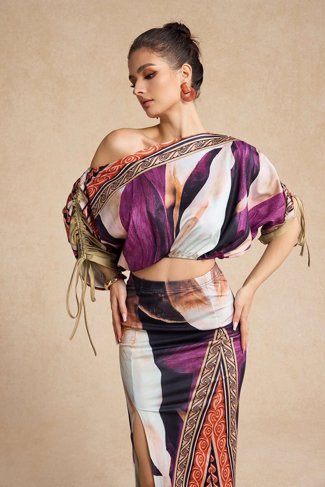Abstract Floral Print Long Sleeve Top and Midi Skirt Combo