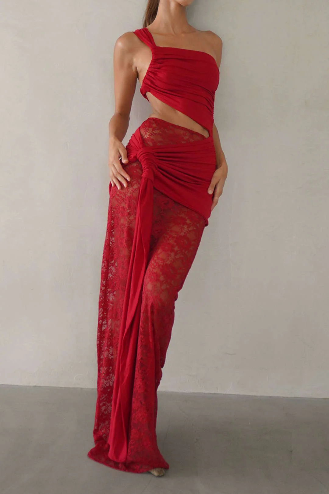 Lace Tie-Front Hollow-Out Patchwork Ruched Skirt Ensemble