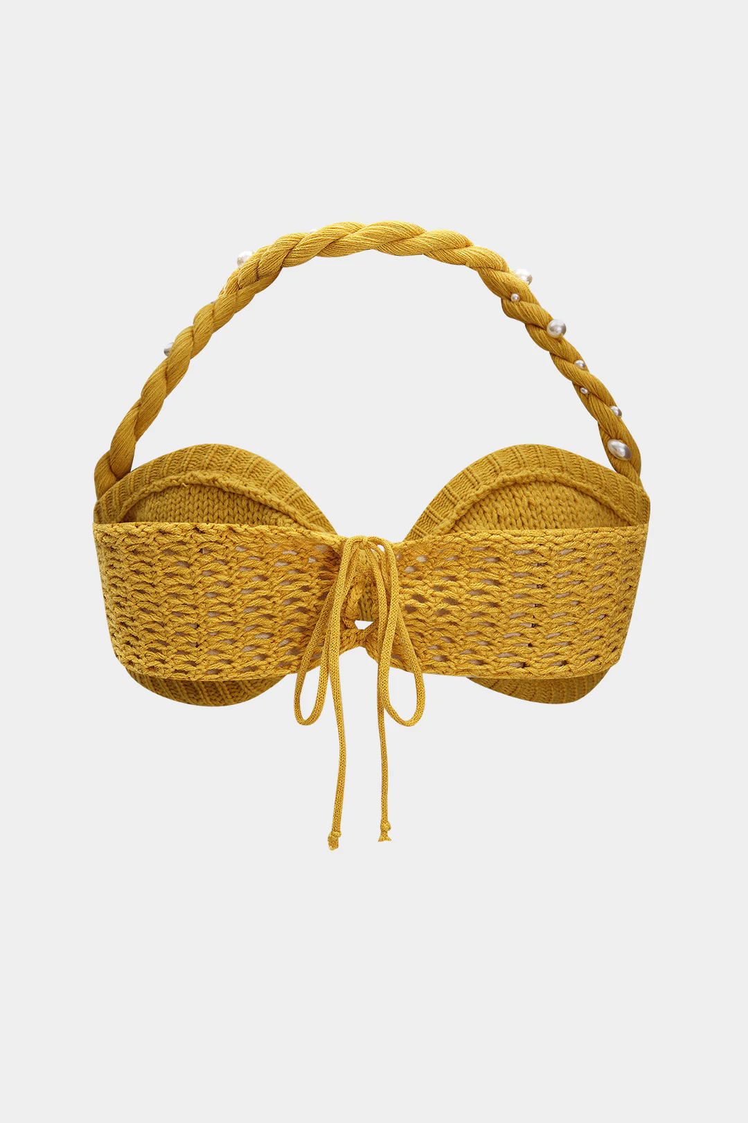 • Plus Size Knitted Halter Neck Braided Pearl - Decorated Tie - Up Tank Top